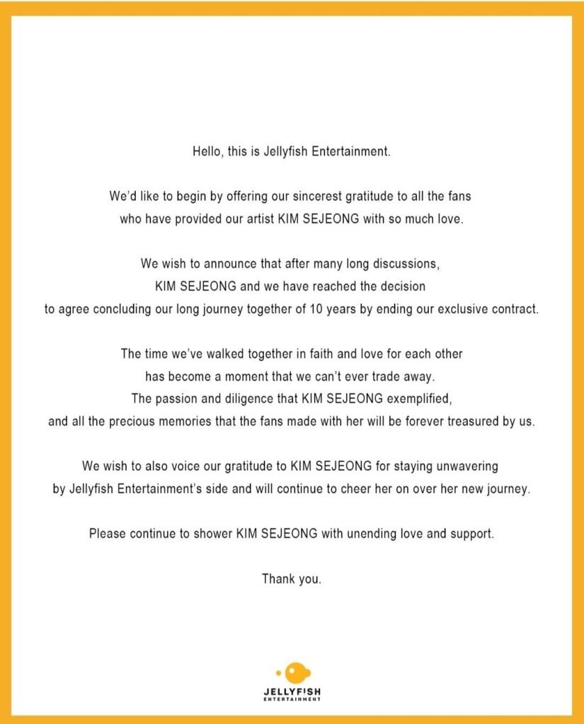 On March 23, Jellyfish Entertainment released the following announcement on their social media accounts.Earlier on March 19, a media outlet reported that KimSeJeong signed an exclusive contract with BHEntertainment. The agency has yet to confirm the report . Kim Se Jeong, who first entered the spotlight as a Jellyfish Entertainment trainee on the Mnet audition show “Produce 101” in 2016, made her debut as a member of the project group 1.0.1 that same year. She later went on to debut as a member of the girl group gugudan before eventually pursuing a solo career and has, in recent years, been focusing more on acting.
